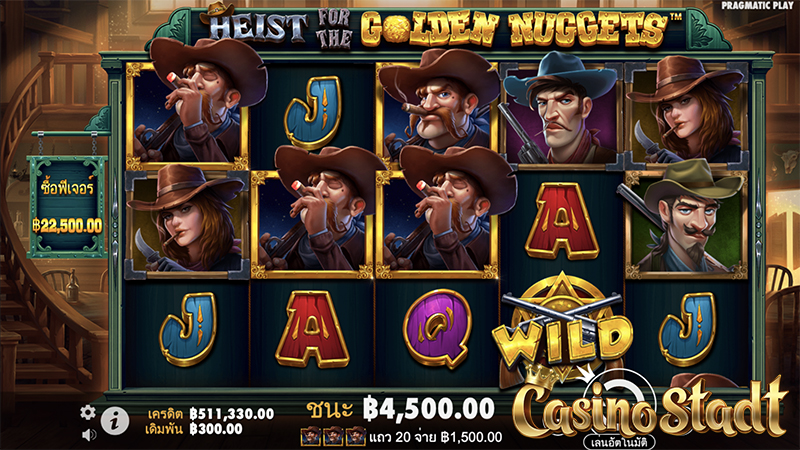Heist for the Golden Nuggets™ ไฮสท์ฟอร์เดอะโกลเด้นนักเก็ตส์ มาในตารางสล็อตขนาด 5 × 3 และเพย์ไลน์ 20 เส้น