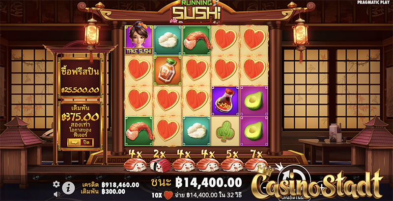 สตูดิโอเกม Pragmatic Play จะพาคุณไปชิมอาหารญี่ปุ่นรสเลิศ! ทั้งซูชิหน้าปลามากุโร่ ซูชิหน้าปลาแซลมอน ฯลฯ ที่ให้ฟีลญี่ปุ่นแบบสุดๆในเกม Running Sushi รันนิ่งซูชิ การปรากฏของสัญลักษณ์ Take Sushi เพียง 3 ตัว ผู้เล่นจะได้รับมูลค่าของซูชิสายพานทั้งหมดบนหน้าจอ! หรือสัญลักษณ์ Take All ในรอบฟรีสปินที่สามารถเก็บยอดสะสมจากมิเตอร์ได้อีกด้วย! และยังสามารถเข้าสู่รอบฟรีสปินกันได้อย่างรวดเร็วเพียงซื้อฟรีสปินได้ในราคาเพียง 85× หรือจ่ายเพิ่มเล็กน้อยเพื่อรับโอกาสเข้ารอบฟรีสปินเพิ่มเป็นสองเท่า! Click here for English Version