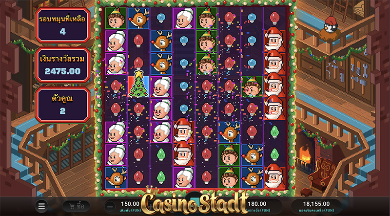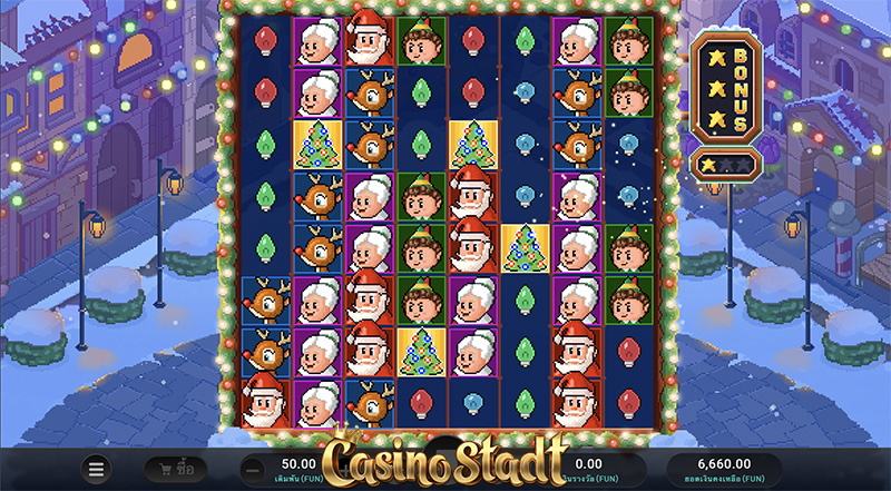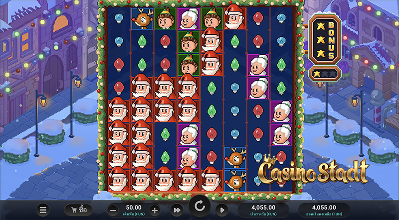 เกม Santa’s Stack ซานต้าสแต็ก มาในสไตล์เรโทรที่ใช้ภาพแบบ 8 บิต ซึ่งทั้งหมดจะมีลักษณะเป็นบล็อกและเป็นพิกเซลเล็กน้อยเหมือนกับเกมที่เคยเล่นกันในสมัยก่อน รวมทั้งเพลงประกอบก็ยังน่ารักมากๆอีกด้วย ชวนให้นึกถึงวิดีโอเกมมาริโอ้เวอร์ชั่นออริจินัลเลยค่ะ การจ่ายรางวัลเป็นแบบคลัสเตอร์เพียงได้สัญลักษณ์ประเภทเดียวกัน 5 ตัวขึ้นไป ซึ่งสัญลักษณ์แต่ละตัวก็แสนจะคิ้วท์มากๆ ทั้งซานต้า เด็กน้อย คุณยาย กวางเรนเดียร์ ฯลฯ สามารถเล่นกันได้เพลินๆไม่เบื่อ พร้อมลุ้นรางวัลสูงสุดได้ถึง ×20,000 เท่าของเงินเดิมพันค่ะ
