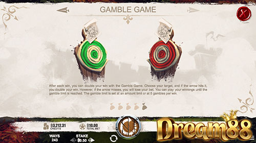 ในกรณีที่เราเล่นแล้วชนะเงินรางวัล ไม่ว่าจะเป็นเงินจำนวนเท่าไหร่ก็ตาม ปุ่ม Gamble จะสามารถใช้การได้ทันทีครับ ถ้าเราเลือกที่จะ Gamble (เดิมพัน) ก็จะถูกพาไปยังหน้าจอถัดไป เป็นการยิงธนูที่เราจะต้องเลือกระหว่างเป้าสีเขียวหรือสีแดง ถ้ายิงโดนก็จะได้รางวัลเพิ่มเป็นสองเท่า แต่ถ้าพลาดเท่ากับจบเกมครับ เงินที่ได้มาก็จะหายไป โดยจะสามารถเล่นได้มากสุด 5 ครั้งต่อเนื่อง