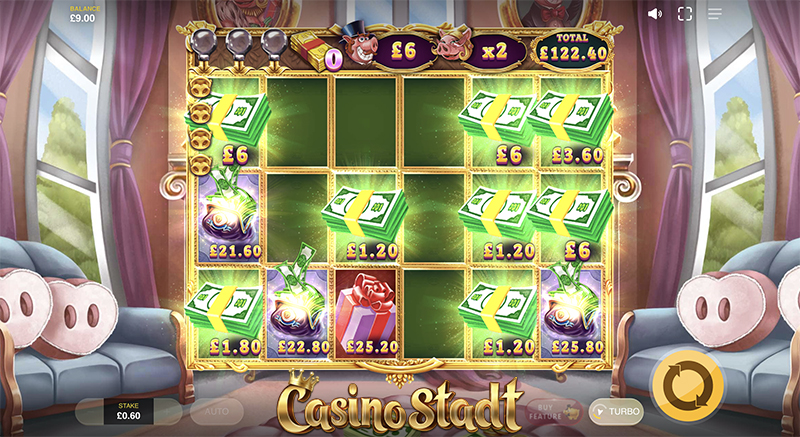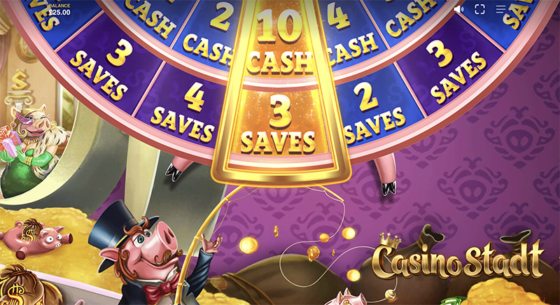 • สุภาพบุรุษหมู – มีมูลค่าอย่างน้อย ×5 ของเงินเดิมพัน เมื่อปรากฏจะเพิ่มมูลค่าให้กับสัญลักษณ์เงินและสัญลักษณ์ถุงเงินทั้งหมดที่อยู่บนหน้าจอ นอกจากนี้ยังเพิ่มมูลค่าให้กับสัญลักษณ์กระเป๋าสตางค์อีกด้วย หากสัญลักษณ์สุภาพบุรุษหมูปรากฏใหม่จะมีมูลค่าเพิ่มขึ้น 5×, 10×, 15×, 25×, 50× และ 100× ตามลำดับ