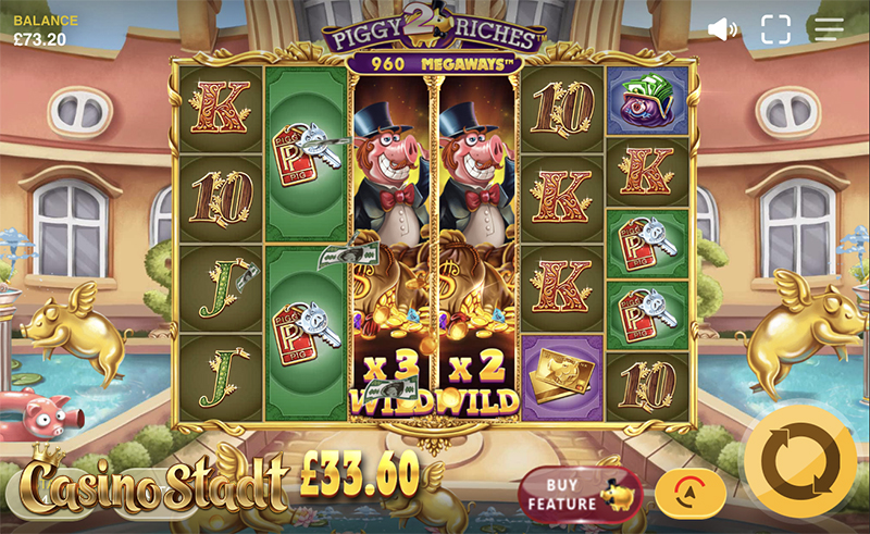 ดื่มด่ำไปกับวิถีชีวิตฟุ่มเฟือยของเศรษฐีหมู ที่อาศัยอยู่ในคฤหาสน์หลังใหญ่ที่ประดับประดาด้วยรูปปั้นสีทองและน้ำพุมากมาย กราฟิกใน Piggy Riches 2 MegaWays™ พิกกี้ริชเชส 2 เมกาเวย์ ถูกปรับปรุงให้มีความสดใสมากขึ้น เพื่อประสบการณ์การเล่นเกมที่ดียิ่งขึ้น ผู้เล่นสามารถกดปุ่ม BUY FEATURE สีแดงซึ่งอยู่ถัดจากปุ่มสปิน เพื่อซื้อฟีเจอร์ได้อย่างสะดวกสบาย ถ้าพร้อมแล้วไปสำรวจโลกของเศรษฐีหมูสุดร่ำรวยกันเลย!