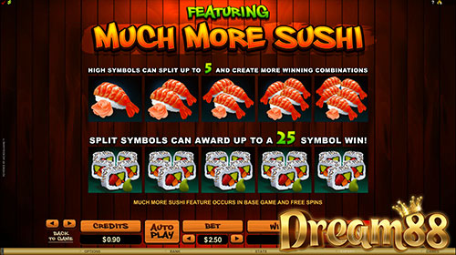 เพื่อที่จะทำให้สล็อตเกมนี้ดูน่าตื่นเต้นมากยิ่งขึ้น Microgaming จึงเพิ่มตัวช่วยให้เราชนะเงินมากขึ้น อย่างโบนัส Much More Sushi ซึ่งก็เป็นโบนัสประเภทหนึ่ง ทุก ๆ ครั้งที่เราชนะเกมจากการได้สัญลักษณ์หลัก ๆ ซูชิพวกนั้นจะแตกตัวออกมากที่สุดคือ 5 ครั้ง นั้นก็หมายความว่า เราสามารถทำคอมโบได้ถึง 25 อัน ทั้งหน้าจอเลยครับ และสิ่งที่มีค่ามากที่สุดก็คือ ซูชิแบบโรลที่จะจ่ายให้ 640 เท่าของเงินที่เราลงไว้ในเส้นนั้น ๆ