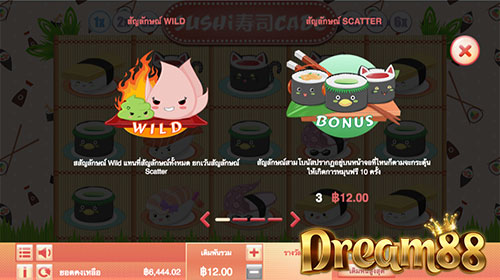 อีกสัญลักษณ์ที่สำคัญไม่แพ้กันคือ Scatter ที่ถูกแทนที่ด้วย รูปซูชิโรลไส้ต่างๆ ผสมรวมกัน สัญลักษณ์นี้จะทำงานก็ต่อเมื่อเราได้ครบ 3 อันบนรีลไหนก็ได้ พอได้ครบตามนี้เราจะได้รับรางวัลเป็นฟรีสปิน 10 ครั้ง และในระหว่างเล่นฟรีสปินก็ยังสามารถรับฟรีสปินเพิ่มเติมได้อีกเรื่อย ๆ ครับ เพียงแค่ได้ Scatter ครบ 3 อัน