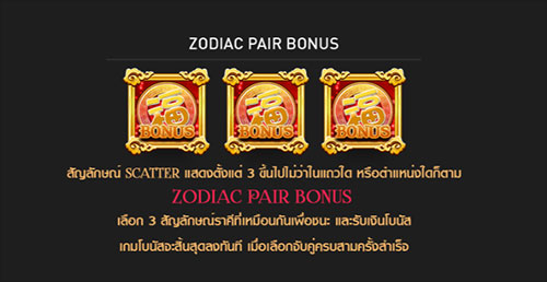 ภายในเกม Zodiac GPI Slot เราจะได้เห็นสัญลักษณ์พิเศษอีกอย่างหนึ่ง คือ สัญลักษณ์โบนัส ซึ่งใช้เป็นรูปตัวอักษรจีน เขียนกำกับใต้รูปว่า Bonus ค่ะ ถ้าเราได้สัญลักษณ์โบนัสครบทั้งหมด 3 อัน ที่ตำแหน่งใดก็แล้วแต่บนหน้าจอ เกมจะพาเราเข้าไปสู่เกม “Zodiac Pair Bonus” และในหน้าจอนี้เราจะต้องทำการสุ่มเลือกปีนักษัตรให้จับคู่กันครบทั้ง 3 คู่เพื่อรับรางวัลค่ะ แต่ไม่ต้องกังวลไปนะคะ แค่ได้เข้าสู่ด่านโบนัสก็เตรียมใจรอรับเงินรางวัลไว้ได้เลย ไม่มีการกลับไปมือเปล่าแน่นอนค่ะ