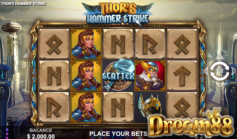 There are 4 dynamic extras in Thor’s Hammer Strike. The Thor’s Respins feature triggers with more than 6 bonus icons. The Free Spins feature is activated when players land 3, 4, or 5 instances of the hammer Scatter, awarding players up to 15 free spins and instant payouts.