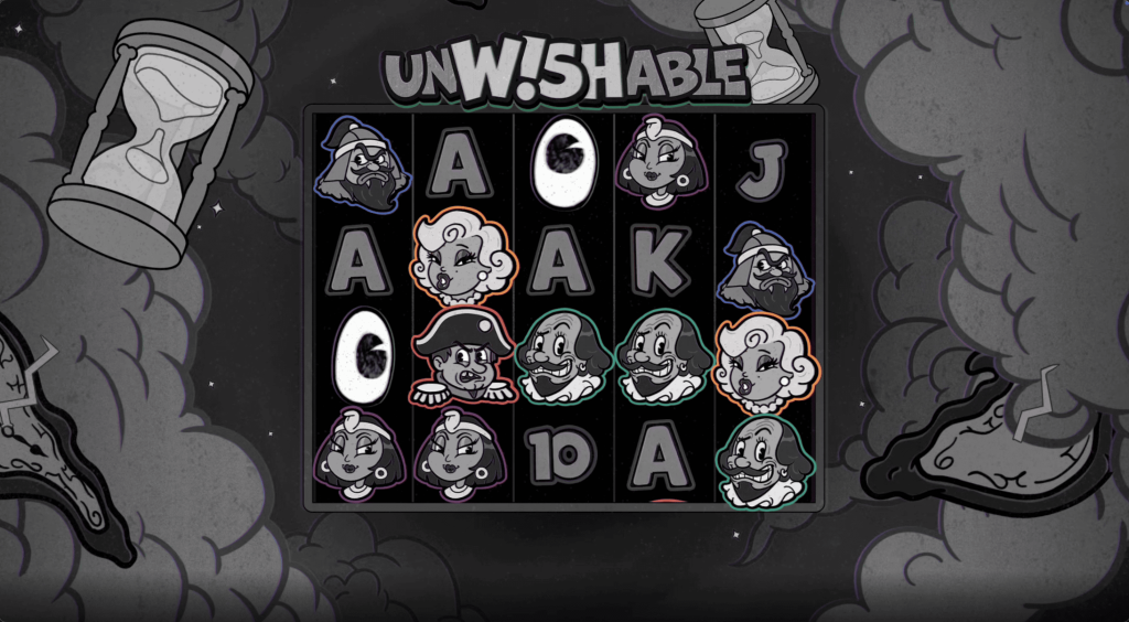 Unwishable runs on a 5×4 layout with 25 paylines and left-to-right pays. It’s high volatility, with a 95.79% RTP and a bet range of $/€0.10 to $/€60 per spin. The theme leans into retro black-and-white cartoon surrealism, mixing art-deco styling with strange, famous-face symbols.